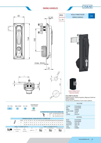Dodatne informacije Područja upotrebe Električne ploče, Ormari za rack, Vrata, Strojevi TIJELO POLIAMID RUČKA POLIAMID MEHANIZAM CINK JEZIČAK ČELIK LOKOT