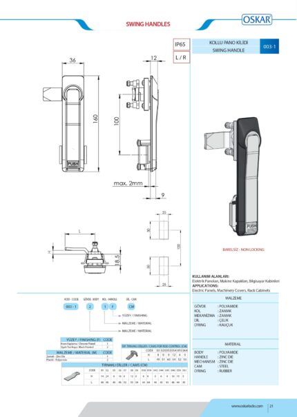 Dodatne informacije Područja upotrebe Električne ploče, Ormari za rack, Vrata, Strojevi TIJELO POLIAMID RUČKA CINK MEHANIZAM CINK JEZIČAK ČELIK O-PRSTEN
