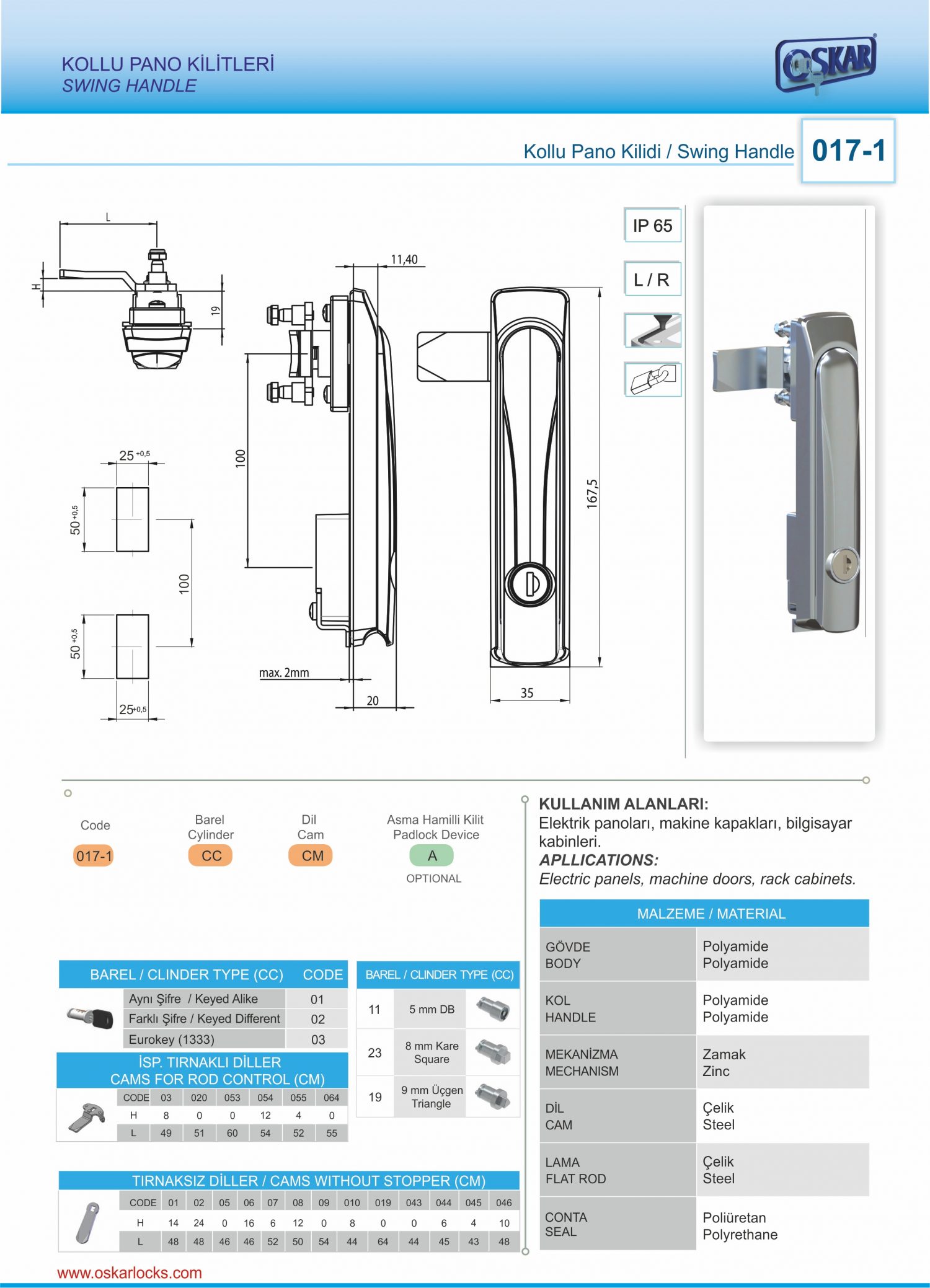 Područja upotrebe Električne ploče, ormarići, strojevi za vrata TIJELO POLIAMID DRŠKA POLIAMID CILINDAR POCINČANE MEHANIZAM CINK ILI POLIAMID LOKOT CINK